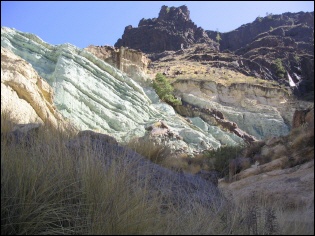 Los Azulejos - blaue und grüne Felshänge. Diese bestehen aus stark mineralhaltigem Tuffgestein und erinnern an den vulkanischen Ursprung der Insel.