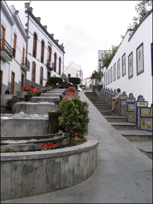 Firgas - der Wasserreichtum von Firgas plätschert den Paseo de Gran Canaria hinab. Margit sitzt auf einem der 21 Azulejos-Sessel, welche mit den Bildern und Wappen der Gemeinden von Gran Canaria geschmückt sind.