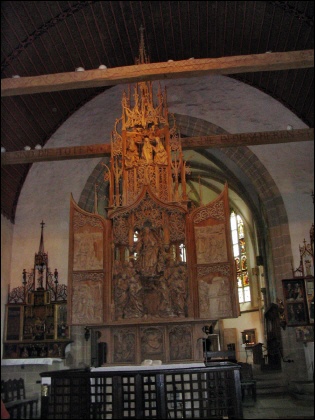 Ab Rothenburg führte uns die erste Etappe zunächst nach Creglingen, wo wir uns in der Herrgottskirche den berühmten Marien-Altar von Tilman Riemenschneider anschauten. Dieser aus Föhren- und Lindenholz geschnitzte Altar beeindruckt durch seine Größe (9,20 m hoch und 3,70 m breit) sowie durch die ausdrucksstarken Gesichter der Holzskulpturen. |