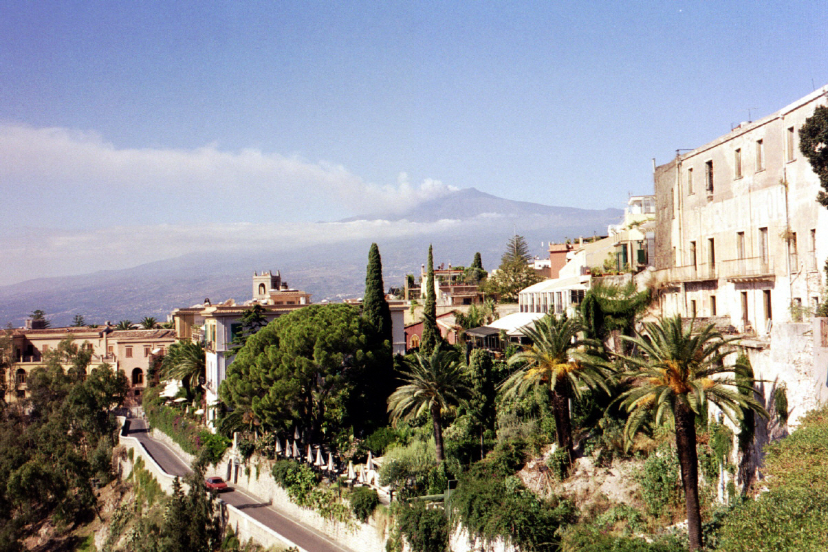 Das Bild zeigt Taormina mit dem Ätna im Hintergrund.